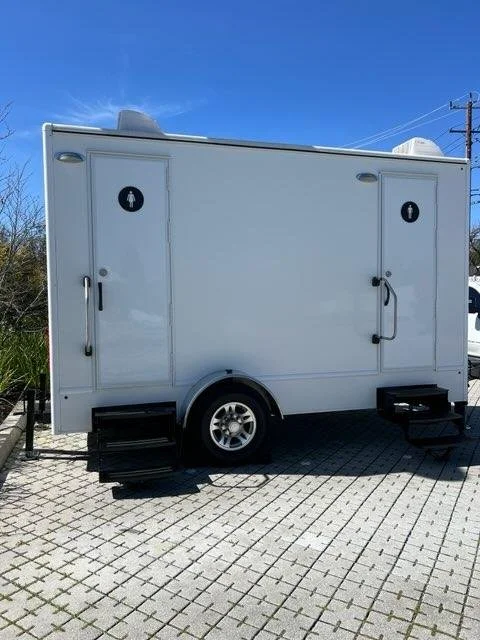 This 2 stall restroom trailer has the largest bathroom stalls, flushing toilets; luxurious features like A/C, music & attractive décor.
